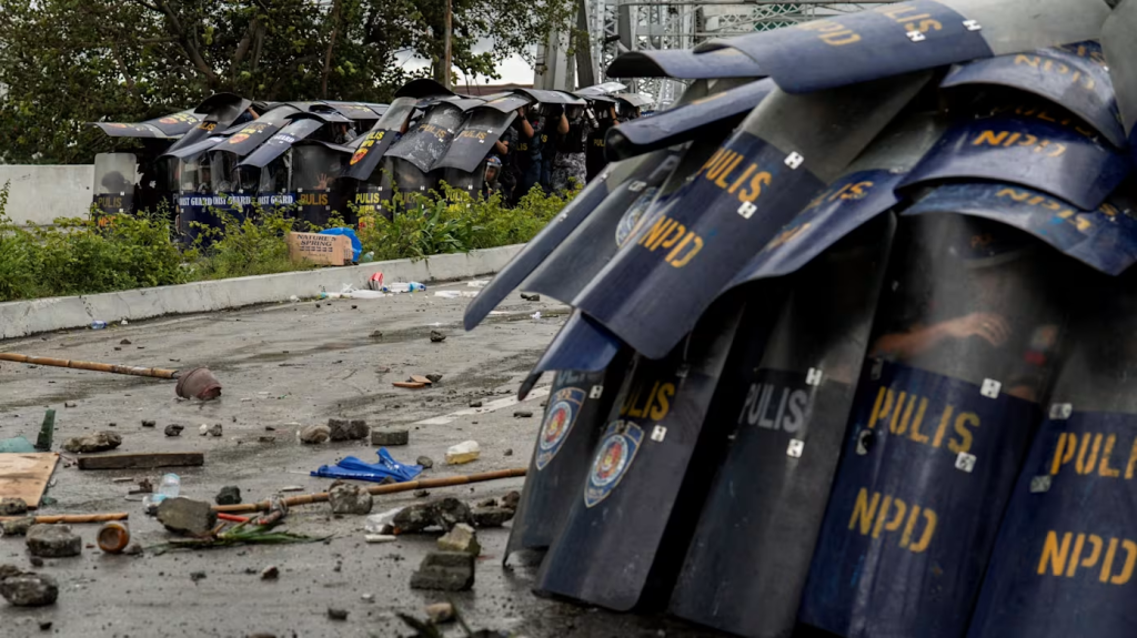 一些人在马尼拉的街头焚烧轮胎并向防暴警察扔石块,而警察也用水炮驱散人群、对付闹事者。警方在总统府周边地区拉起封锁线并设置路障。