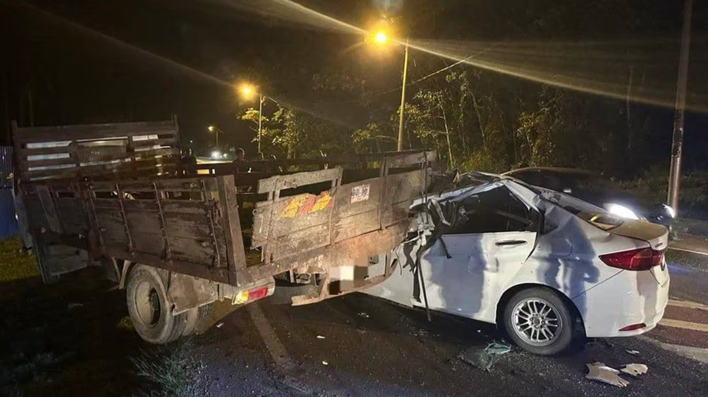 马来西亚柔佛州发生一起严重车祸,一辆轿车猛烈撞上停靠路边的罗厘,导致轿车的前座乘客尸首分离,当场死亡。