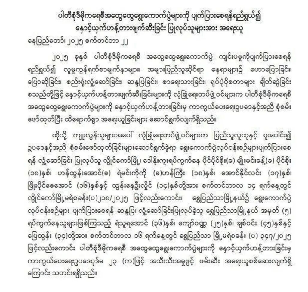 在仰光省瑞比达镇区,有四名男子被卷入此次事件。36岁的耶杜拉昂(ရဲသူရအောင်)、25岁的觉瓦纳(ကျော်ဝဏ္ဏ)、45岁的奇温(ချစ်ဝင်း)和34岁的比吞(ပြေထွန်း),他们被指涉嫌组织示威、鼓动群众,意图破坏选举程序。9月16日,瑞比达警察局以案件编号(u)347/2025,依据《保护选举免遭破坏法23条(a)款》对他们立案调查。