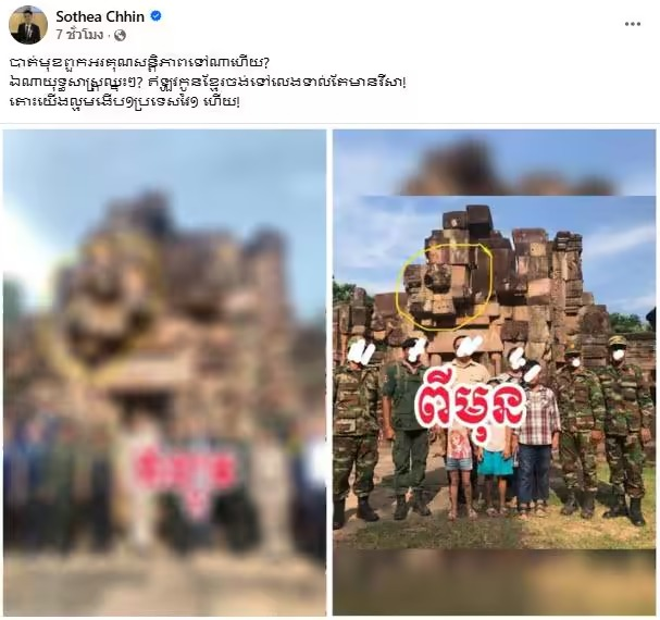 10月4日,资深军事记者瓦萨纳发布了一则帖子,配图为泰国总理阿努廷到Ta Muen Thom古寺视察的照片,其在帖子中表示:“看照片背景!!总理访问了Ta Muen Thom古寺,证明泰国军队成功守住了该地。”此事引发了柬埔寨社交媒体上的热烈讨论,一名柬埔寨网红转发了该照片并评论道说,和平运动人士都去哪了?胜利策略又在哪里?现在柬埔寨人想进入这片区域要有签证。