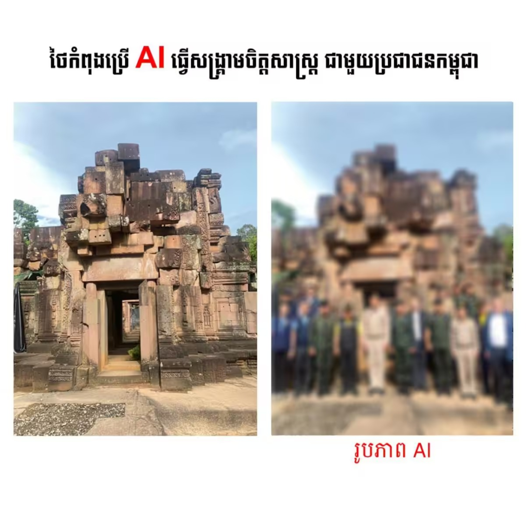 不少柬埔寨社交媒体用户留言表示,这张照片是AI生成的,泰国正在用AI图片对挑衅柬埔寨公民。还有人评论说,泰国一直利用这种虚假图片进行心理战,挑拨柬埔寨内部分裂,如果这次真的引发分裂,有谁知道会发生什么,泰国总是制造虚假图片欺骗公众。