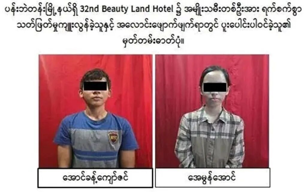 缅甸当地警方于10月8日发布通告,日前在仰光班贝坦镇区(Pabedan Township;ပန်းဘဲတန်းမြို့နယ်)一家酒店发生的残忍杀害一名年轻女子并肢解遗体案件已告破,一对青少年情侣作为凶手被确认身份并逮捕。