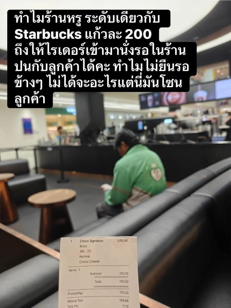 10月12日,据泰媒报道,泰国社交媒体上掀起一场关于“外卖骑手是否能在高级咖啡店内等单”的激烈争论。一名网友在社交平台上传了一张照片,显示一名外卖骑手坐在一家星巴克内等候,并配文质疑道:“为什么像星巴克这种一杯就要200泰铢的高档咖啡店,竟然允许骑手坐在店内和顾客一起等?为什么不能在外面等?这可是顾客区。” 这条帖文迅速引发了网友的广泛讨论和批评。
