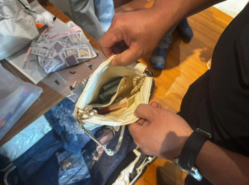 移民局官员在女嫌犯的手提包内搜出部分现金。