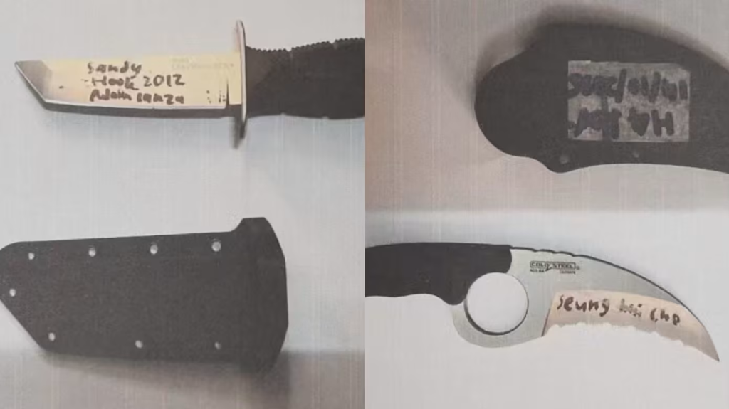 雪州总警长也公布了凶手持入学校的三把刀具,其中两把刀具的刀身上写着两个美国校园凶杀案枪手赵承熙(Seung Hui Cho)和亚当兰扎(Adam Lanza)的名字。