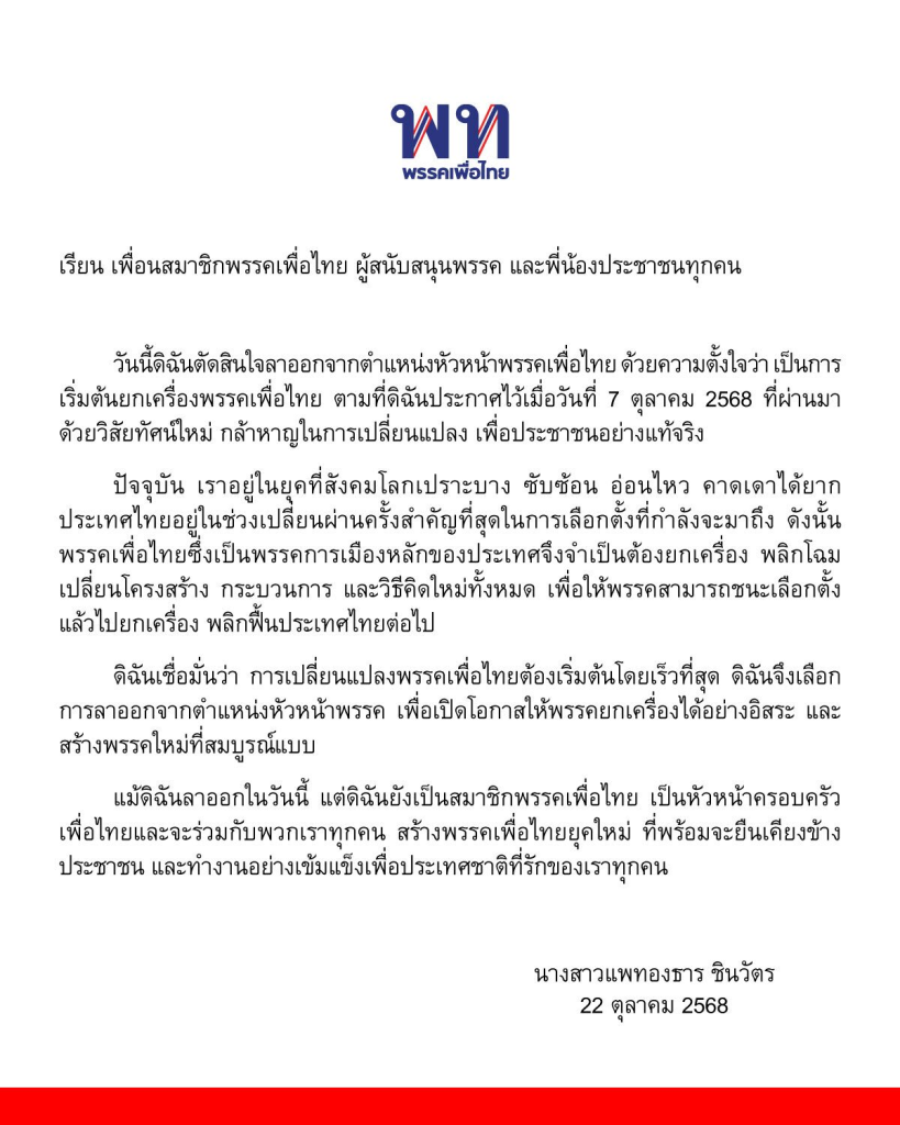 今天,佩通坦决定辞去为泰党党魁的职务,旨在启动她于2025年10月7日宣布的为泰党全面改革计划,以全新的愿景,勇敢的变革,真正为人民服务。