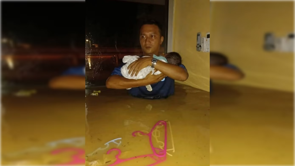 一名男子抱着婴儿涉水逃生的画面在社媒广传,画面可见水位淹至男子胸口位置,他双手擡高捧着婴儿,走到安全处。但后来得知男子并非婴儿的父亲,只是在危急之下伸出援手。