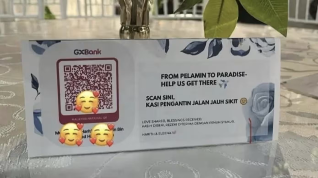 这对新人在宴席桌上摆放小牌子,上面写着“扫描这里,让新人去远一点的旅行”(Scan sini, kasi pengantin jalan jauh sikit),并附上二维码,供宾客扫码转账。