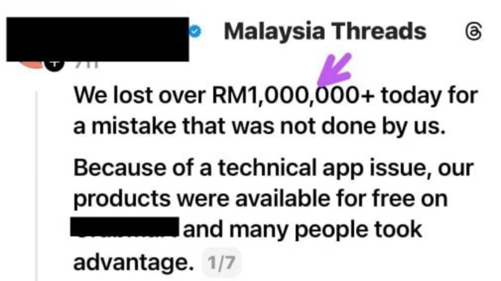 据了解,故障期间不少用户趁机提交价值高达1000令吉(313新元)的订单,甚至在网上呼吁“赶紧免费领取”,直到平台修复系统为止。