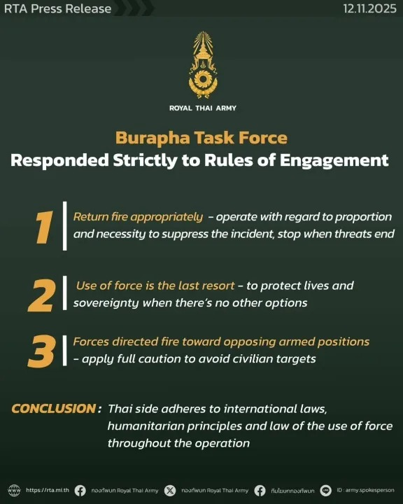 11月12日21点21分,泰国陆军东部部队就沙缴府泰柬边境的局势发布声明称,泰方全程在国际准则框架下行动,坚持人道主义与国际交战规则,具体包括: