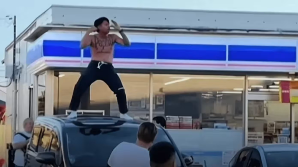 11月17日,这名网红站在富士河口湖的罗森(Lawson)便利店前的车顶上,其举动吸引不少路人驻足拍照。