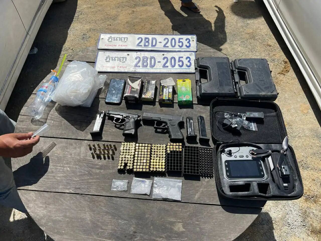 但当宪兵抵达其住所时,该嫌疑人已不知所踪,仅留下大量涉案物品。经现场清点,警方查获的证物包括:疑似高纯度冰毒的白色晶体粉末,共3大包;现代系列汽车2辆、摩托车1辆;短柄冲锋枪2支、弹匣3个及配套子弹181发;一批吸毒工具。目前,所有涉案证物已由实居省巴塞县地方武装部队依法移交至茶胶省武装部队,以便于后续的案件侦办工作。警方正在全力追缉在逃嫌疑人。