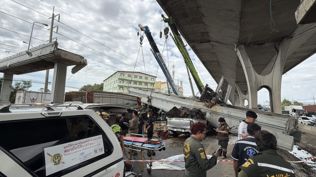 12月18日上午9时左右,曼谷Bang Phli Noi警察局接到报警,称一座人行天桥的横梁断裂坠落,砸中下方车辆,造成人员伤亡。事故发生于曼谷—达叻公路进城方向快速车道第34公里处,北榄府Bang Phli Noi镇境内。