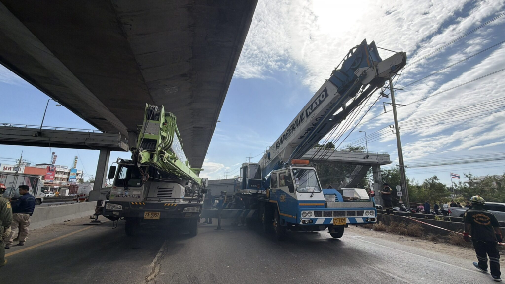 北榄府府尹表示,天桥坠落造成车辆损毁与人员伤亡,已指示相关部门全力处置。由于坍塌桥体重达60至70吨,现有两台起重机难以吊移,正协调增派一台起重机支援,预计作业将持续至傍晚,呼吁公众继续绕行。