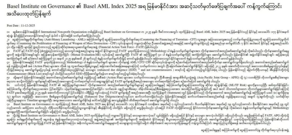 近期,瑞士非营利国际组织巴塞尔治理研究所(Basel Institute on Governance)发布了《2025年巴塞尔反洗钱指数》中涉及缅甸的相关评级,将缅甸列为洗钱风险最高的国家,排名第一。对此,缅甸反洗钱和反恐怖主义融资工作组于12月11日发表正式声明,对此评级结果表示反对。