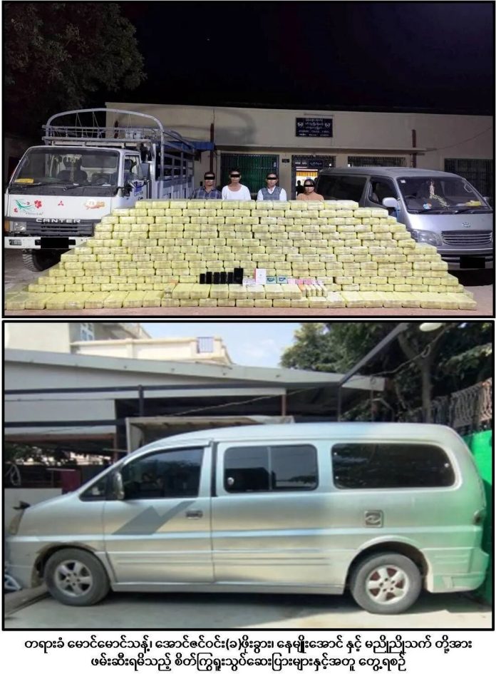 缅甸禁毒中央委员会消息,包括缉毒警察部队成员在内的联合小组,根据情报于12月24日下午5时,在马圭省敏巫镇甘耶村附近,截获了一辆由昂辛温(又名)波夸驾驶、貌貌丹随行的六轮”CANTER”货车,查获14986200片(当地估价374.655亿缅币)麻黄素药片。