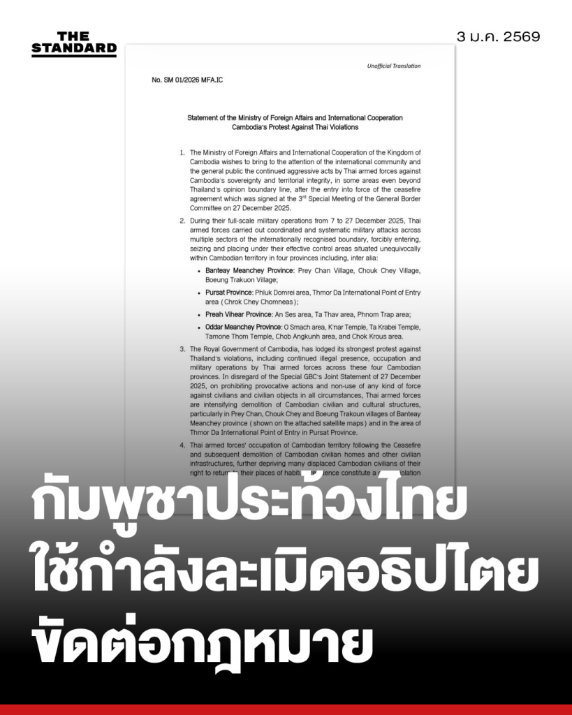 据泰国媒体报道,1月3日,柬埔寨外交与国际合作部发表正式声明,向泰国提出外交抗议,指控泰国军方于2025年12月7日至27日期间在柬埔寨境内展开军事行动,占领多处边境地区,严重侵犯柬埔寨主权与领土完整,违反国际法相关原则。