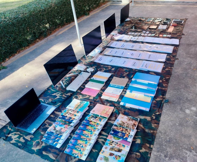 此外,大楼内还缴获大量工作手册,包括操作指南、对话脚本、吸引注意力技巧、员工知识测试题,以及受害者信息等,这些资料散布在楼内各办公桌上。其他查获的物品包括:电脑、笔记本电脑、30余部手机、平板电脑、大量SIM卡、记事本、财务文件、身份证、信用卡、NFC卡扫描器、假钞,以及大量其他电子设备和文件。
