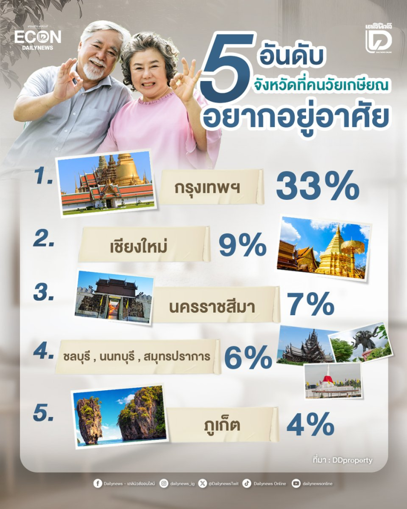 消费者退休后最想生活的城市排名中,曼谷位居首位,占比33%,其优势在于作为首都的全方位便利,公共设施齐全,医疗标准高且技术先进,能够应对长期健康照顾。随后依次为清迈,占比9%;呵叻府,占比7%;春武里府、暖武里府、北榄府均占比6%;普吉府占比4%;另外11%表示无特定地点,只要在泰国就可以。