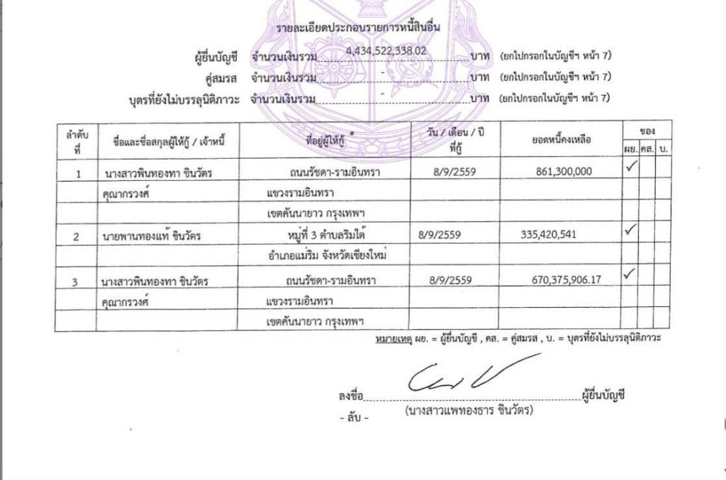 其个人负债为44.34亿泰铢,主要为向亲属购买股份所出具的本票或借据。年收入申报为2087.91万泰铢(主要为股息及利息收入),年支出为5822万泰铢,涵盖保险、个人与家庭支出、子女教育、捐赠及旅游等项目。