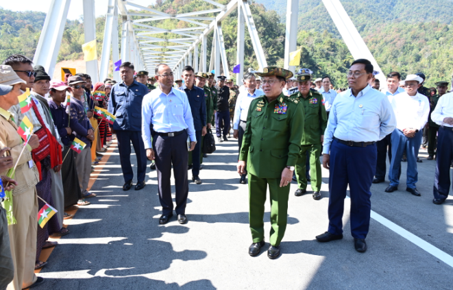 据缅甸媒体报道,昨日上午,萨尔温江(达桑)大桥通车仪式在掸邦南部孟板镇区达桑村附近举行。国家管理委员会主席、国家总理、国家和平与发展委员会主席敏昂莱大将出席了通车仪式。仪式上,委员会秘书长耶温乌、联邦部长查理丹博士、妙登觉博士、缪丹以及掸邦首席部长昂昂共同为大桥剪彩。敏昂莱大将为大桥揭牌并泼洒香槟水以示祝福。联邦建设部部长向大将赠送了大桥纪念礼品。随后,大将向当地学生和居民发放了现金奖励。大将及随行人员在大桥前合影留念。出席仪式的还有来自国防军总司令部的军方高级官员、三角军区司令、东部中央军区司令、相关部门官员及当地居民。仪式结束后,敏昂莱大将及随行人员一同步行参观了新建成的萨尔温江(达桑)大桥。