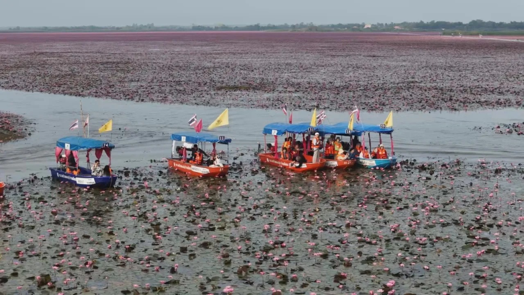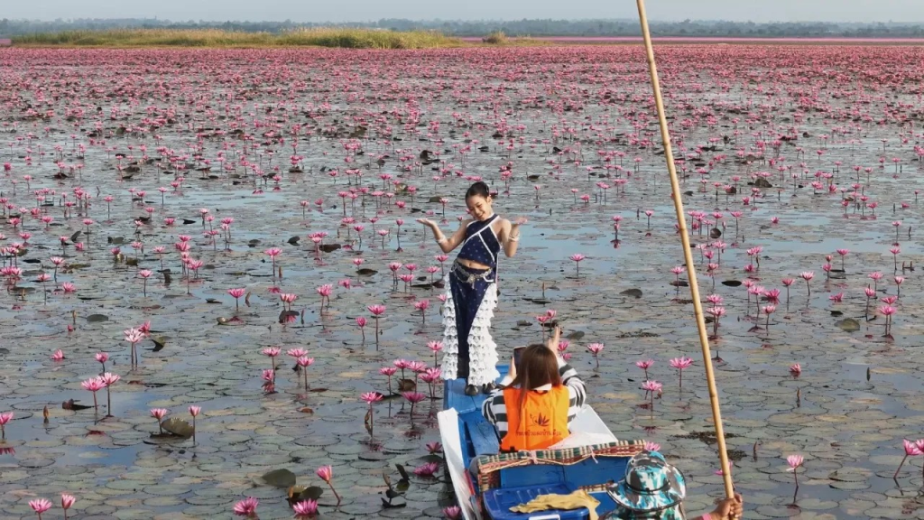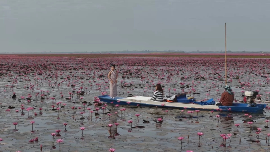 1月24日,泰国乌隆他尼府Kumphawapi县Chiang Wae镇Ban Die码头一早就挤满了前来观赏红莲海的游客,其中有泰国本地人,也有外国游客,大多结伴自驾或租车而来。他们表示,想跟随Lisa的宣传照来亲眼见证美景。很多游客从清晨就开始排队预约,大部分还特别询问,是否有宣传照中Lisa乘坐的那种小型长尾船。