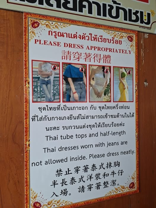 有网友在社交媒体分享了一张现场张贴的告示牌,内容以泰文、英文与中文写明:禁止穿着泰式抹胸、半长泰式洋装和牛仔裤入场。请穿着整洁。