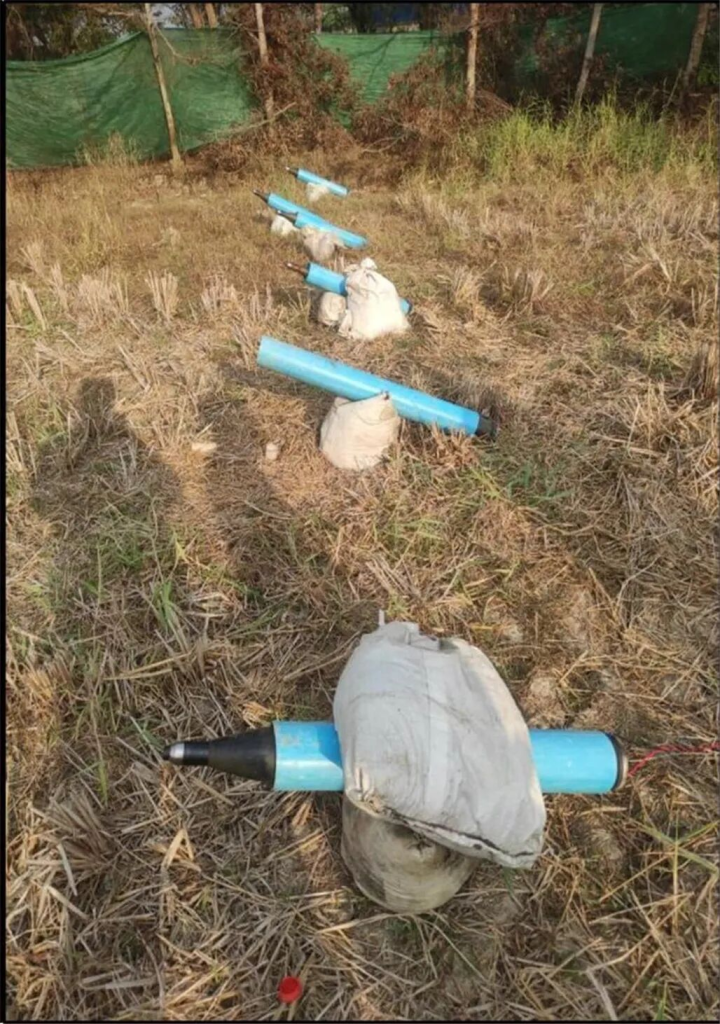 消息称,当地民众在农田中发现可疑物品,随即向当局报告。驻扎在附近的安保部队接报后立即赶赴现场进行排查。经检查,这些武器为“人民防卫军PDF”武装分子准备用于袭击的PC管(蓝色)绑制而成的火箭弹,共计6枚。