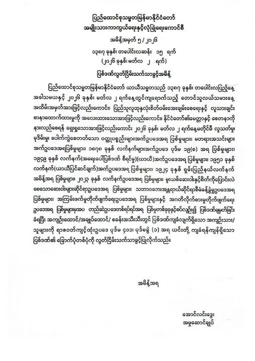 缅甸国家国防与安全委员会发布公告,为纪念直榜月盈日(Tabaung Full Moon Day)暨缅甸农民节,将对全国各监狱在押囚犯实施减刑特赦。根据公告,所有正在服刑的囚犯将获得原判刑期六分之一的赦免。