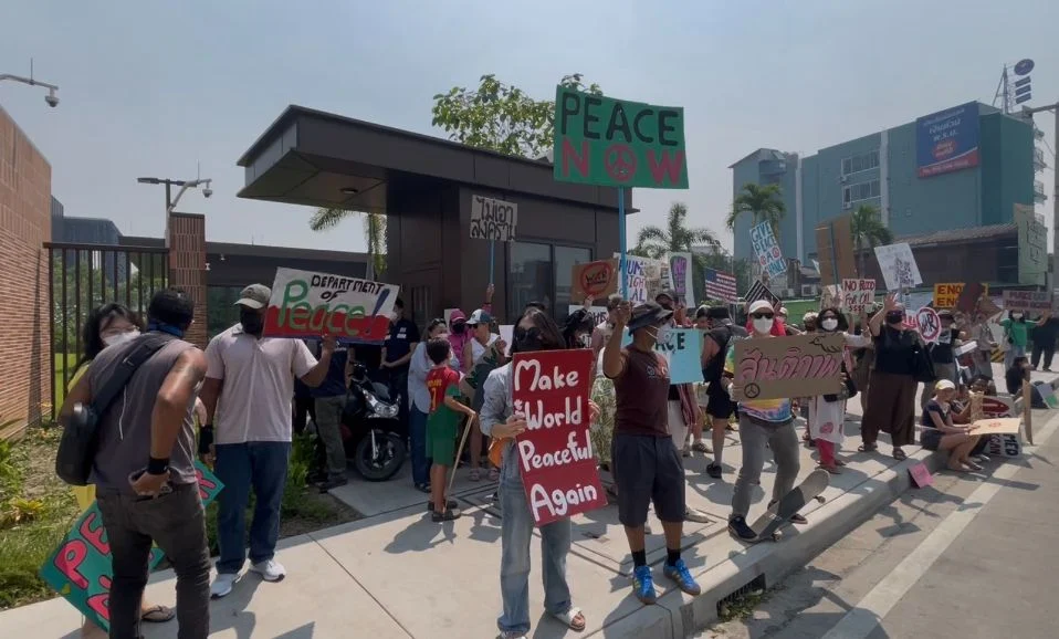 据泰媒报道,3月28日,约百名居住在清迈的美国人、泰国人及来自多个国家的外籍人士聚集在美国驻清迈总领事馆前,举行和平集会,呼吁停止当前美国与伊朗之间的军事冲突。此次集会由自称“CNX4PEACE”的团体组织,过程平稳有序,参与者通过举牌、集体发声等方式表达诉求,并由代表宣读声明。