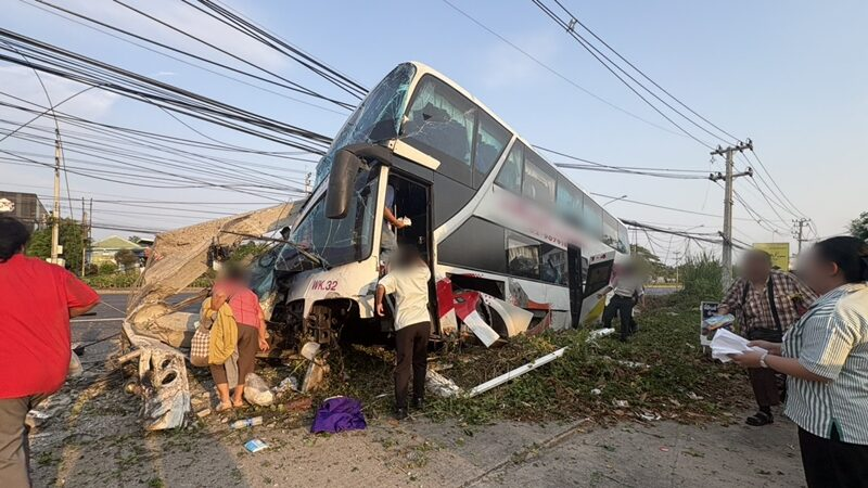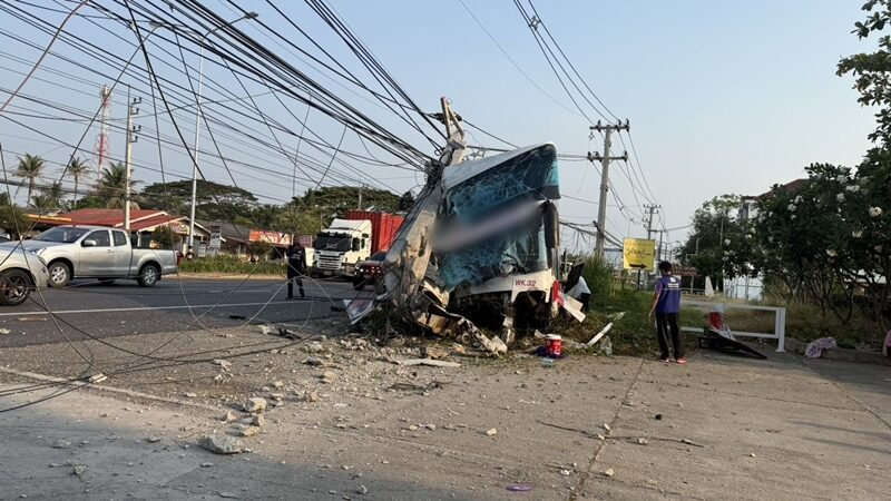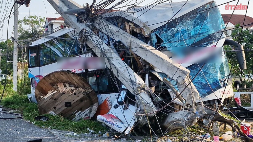 52名乘客惊魂未定,泰国一旅游大巴失控撞毁电线杆