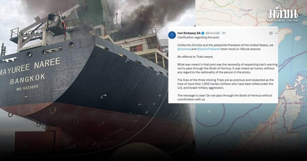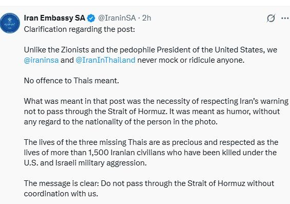 使馆进一步说明,与其社交账号@iraninsa及@IranInThailand从未嘲笑任何人,相关内容也并未针对照片中人员的国籍。声明强调,帖文真正想传达的信息,是提醒各方尊重伊朗此前发布的警告:船只在通过霍尔木兹海峡前,应先与伊方进行协调沟通,不应在未进行必要联络的情况下航行经过该海域。