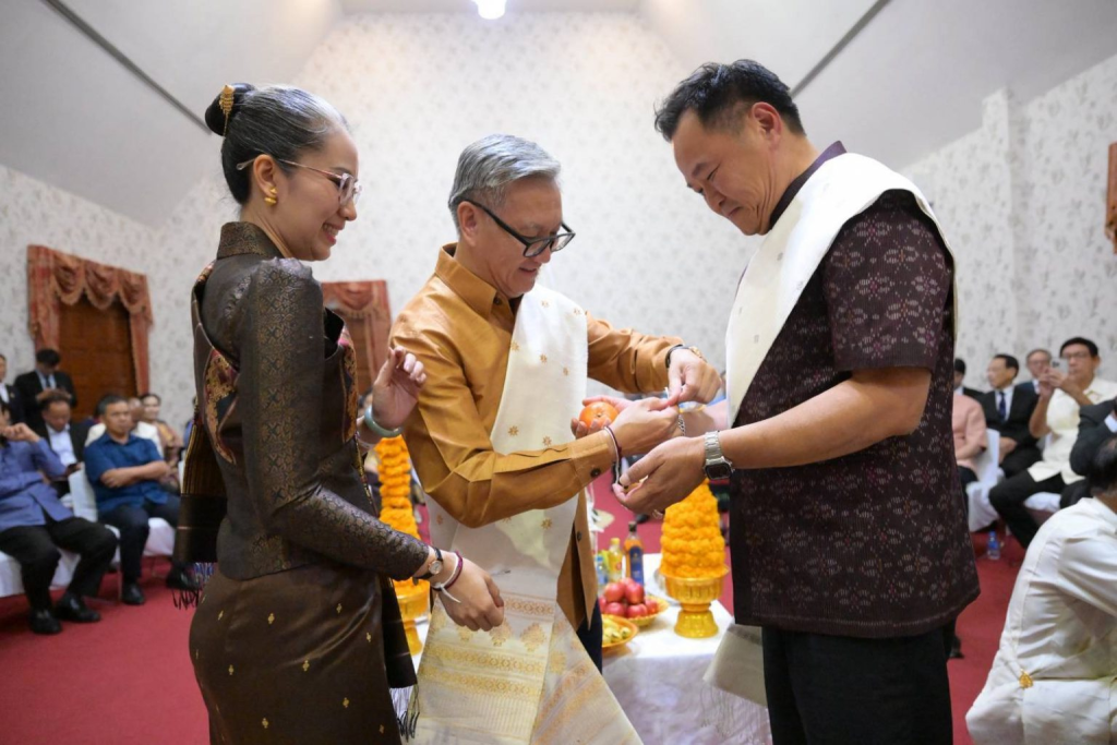 4月5日17点,泰国总理兼内政部部长阿努廷前往老挝驻泰国大使馆,出席2026年老挝宋干节新年活动。老挝副总理兼外交部部长通沙万及夫人瓦达沙纳、老挝驻泰国大使西萨瓦在场热情接待。阿努廷向西萨瓦赠送花瓶表达祝贺,并一起参与拴线祈福仪式(Baci)。这是老挝重要的传统仪式之一,通过诵经、涂抹圣水和系祝福线,祈求吉祥。