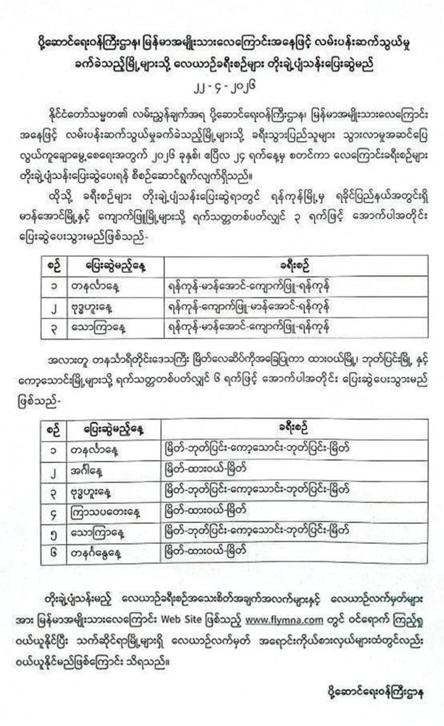 据缅甸交通运输部消息,根据国家总统的指示,缅甸国家航空(MNA)将于4月24日起,增开从仰光前往若开邦曼昂(Man-aung)、皎漂(Kyaukphyu)等交通不便城市的航班,以方便当地民众出行。
