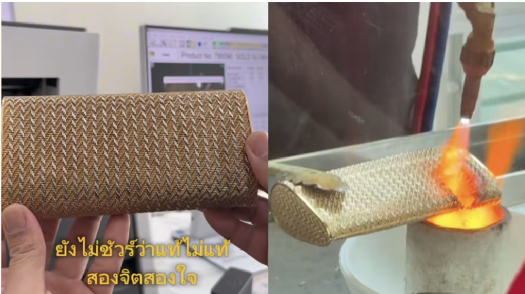 这个名为“Wit Lat Krabang Gold Shop”店家,在Facebook专页上传视频,声称有顾客将一个从日本二手店以300泰铢购买的包包,送到他们的店检验,没想竟有意外的发现。